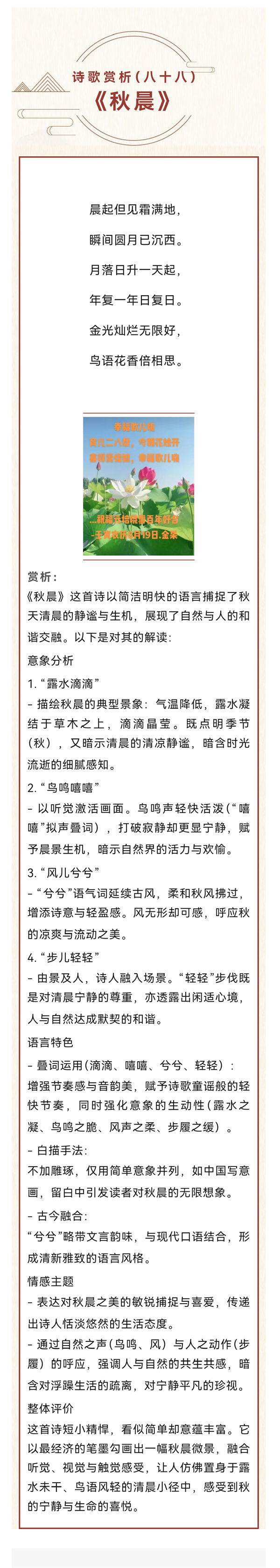 【侯庆桥·兮辞】诗歌赏析(八十八)秋晨 2025-11-7 本文被阅读 1 次