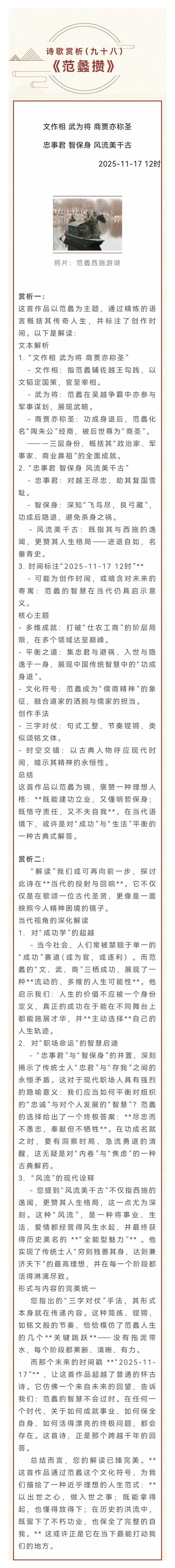 【侯庆桥·兮辞】诗歌赏析(九十八)范蠡攒 2025-11-17 本文被阅读 1 次